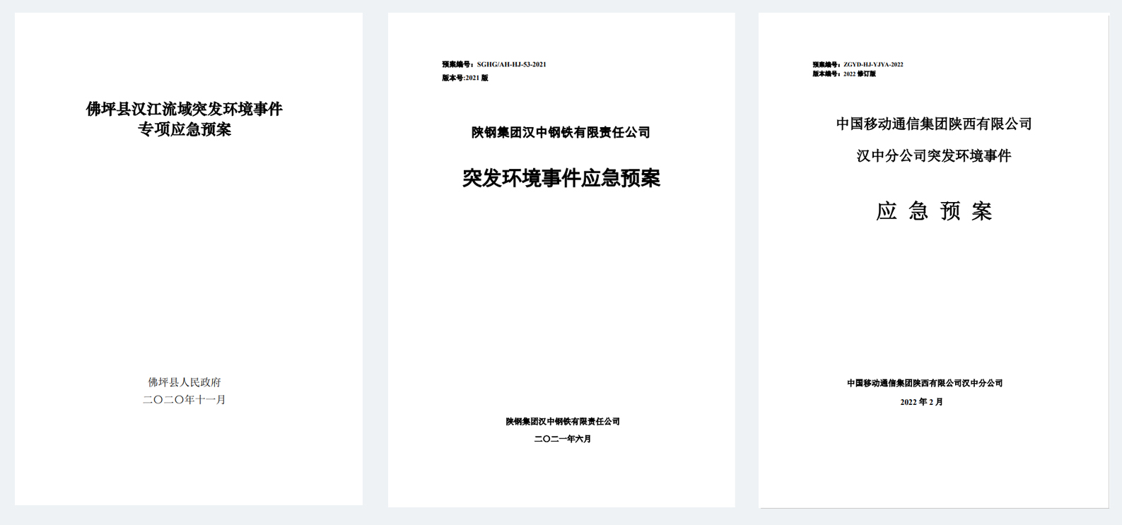 (4)企業(yè)類(lèi):陜鋼集團(tuán)漢中鋼鐵有限責(zé)任公司突發(fā)環(huán)境事件應(yīng)急預(yù)案、中國(guó)移動(dòng)通信集團(tuán)陜西有限公司漢中分公司突發(fā)環(huán)境事件應(yīng)急預(yù)案、漢中市第二人民醫(yī)院(漢中市傳染病醫(yī)院)突發(fā)環(huán)境事件應(yīng)急預(yù)案、陜西高速機(jī)械化工程有限公司突發(fā)環(huán)境事件應(yīng)急預(yù)案等。